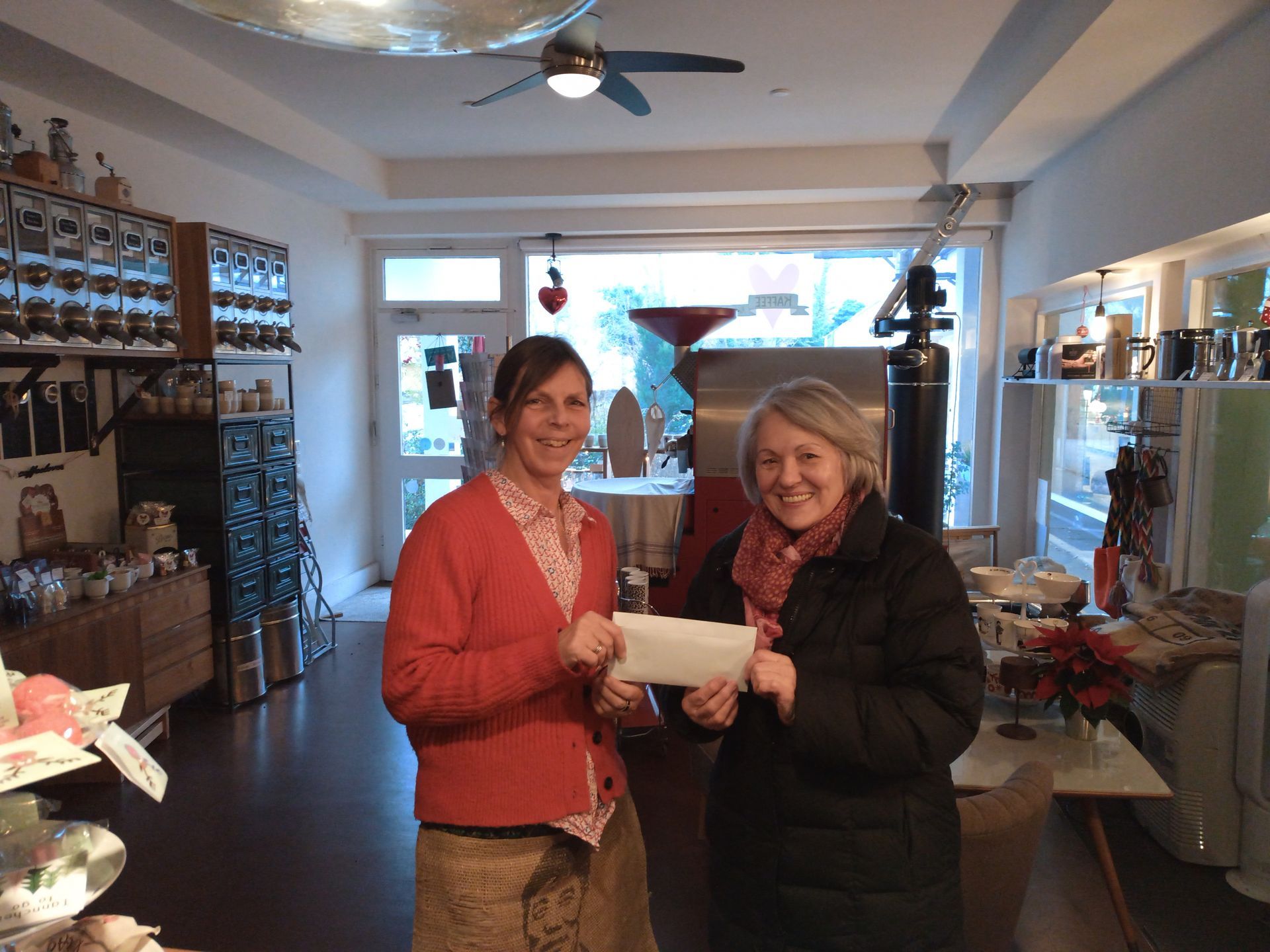Inhaberin Stephanie Leonhardt (li) übergibt die Spende an Irmgard Schleich