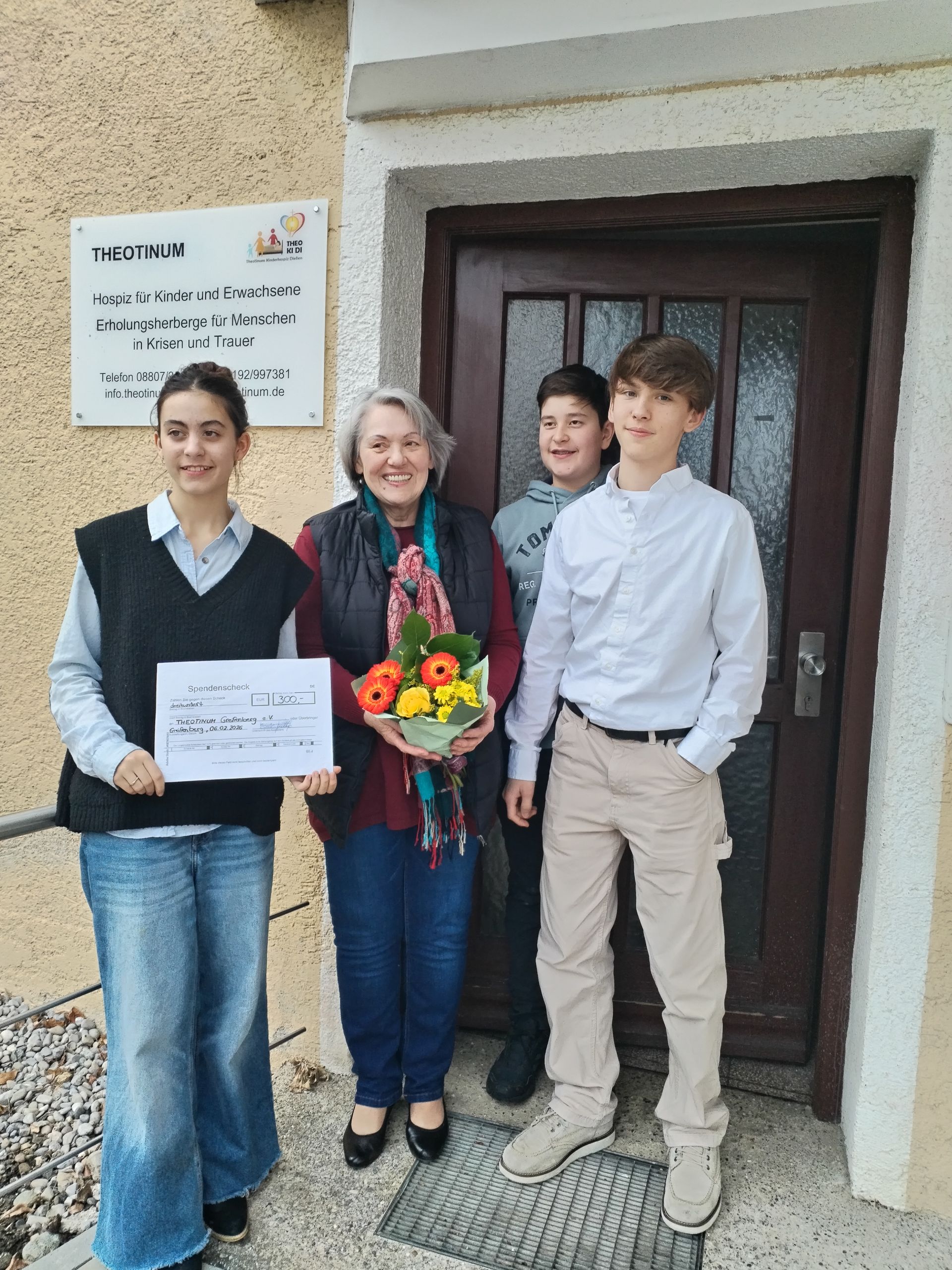 Schüler der 8b / Rhabanus-Maurus-Gymnasium, St. Ottilien übergeben den Scheck an die Koordinatorin des THEOTINUM – Hospizes Irmgard Schleich