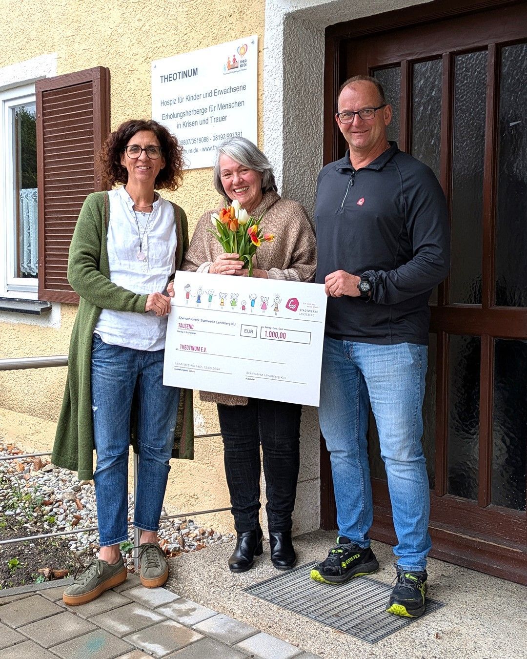 Bildunterschrift Bild 1: Sabine Mendler (links) und Karsten Kautzner (rechts) von den Stadtwerken Landsberg KU überreichen Irmgard Schleich (Mitte) vom Theotinum e. V. einen Spendenscheck über 1.000 Euro sowie einen Strauß Tulpen. (Foto: Stadtwerke Landsberg KU, zum Abdruck frei)